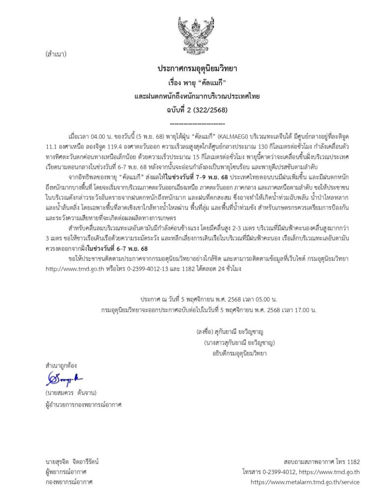 วันที่ 5 พ.ย. 2568 กรมอุตุนิยมวิทยา ประกาศเรื่องพายุ “คัลแมกี” และฝนตกหนักถึงหนักมากบริเวณประเทศไทย ฉบับที่ 2 โดยระบุว่า เมื่อเวลา 04.00 น. ของวันนี้ (5 พ.ย.) พายุไต้ฝุ่นคัลแมกี (KALMAEGI) บริเวณทะเลจีนใต้ มีศูนย์กลางอยู่ที่ละติจูด 11.1 องศาเหนือ ลองจิจูด 119.4 องศาตะวันออก ความเร็วลมสูงสุดใกล้ศูนย์กลางประมาณ 130 กิโลเมตรต่อชั่วโมง กำลังเคลื่อนตัวทางทิศตะวันตกค่อนทางเหนือเล็กน้อย ด้วยความเร็วประมาณ 15 กิโลเมตรต่อชั่วโมง พายุนี้คาดว่าจะเคลื่อนขึ้นฝั่งบริเวณประเทศเวียดนามตอนกลางในช่วงวันที่ 6-7 พ.ย. 2568 หลังจากนั้นจะอ่อนกำลังลงเป็นพายุโซนร้อน และพายุดีเปรสชันตามลำดับ