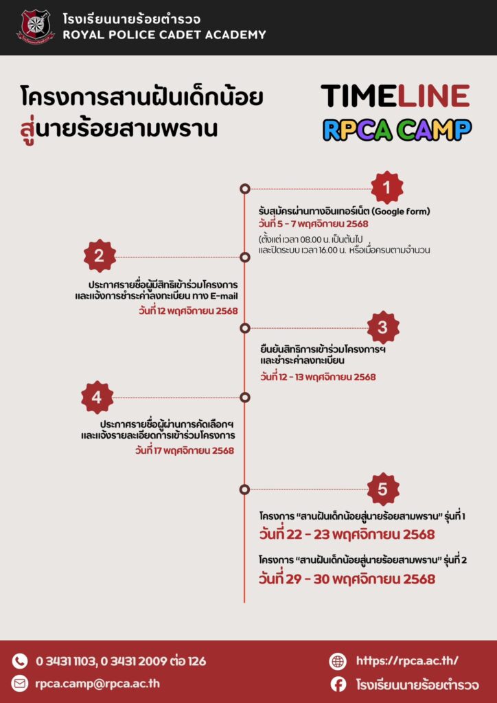 กำหนดการรับสมัคร : วันที่ 5 – 7 พฤศจิกายน 2568 : รับสมัครทางระบบอินเทอร์เน็ต (Google form) (วันแรกเปิดระบบตั้งแต่เวลา 08.00 น. เป็นต้นไป และวันสุดท้ายปิดระบบเวลา 16.00 น.) วันที่ 12 พฤศจิกายน 2568 : ประกาศรายชื่อผู้มีสิทธิเข้าร่วมโครงการฯ ทาง E-mail วันที่ 12 – 13 พฤศจิกายน 2568 : ยืนยันสิทธิการเข้าร่วมโครงการฯ และชำระค่าลงทะเบียน วันที่ 17 พฤศจิกายน 2568 : ประกาศรายชื่อผู้ผ่านการคัดเลือก ทาง Facebook โรงเรียนนายร้อยตำรวจ และ E-mail