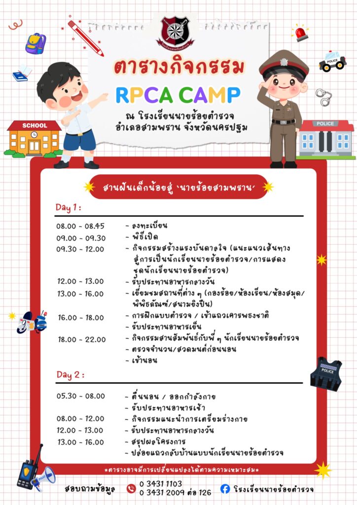 กำหนดการจัดกิจกรรม :รุ่นที่ 1 วันที่ 22 – 23 พฤศจิกายน 2568 รุ่นที่ 2 วันที่ 29 – 30 พฤศจิกายน 2568 ระยะเวลา 2 วัน 1 คืน (ค้างคืน)สถานที่จัดกิจกรรม : โรงเรียนนายร้อยตำรวจ อำเภอสามพราน จังหวัดนครปฐม จำนวนที่รับ 100 คน / รุ่น