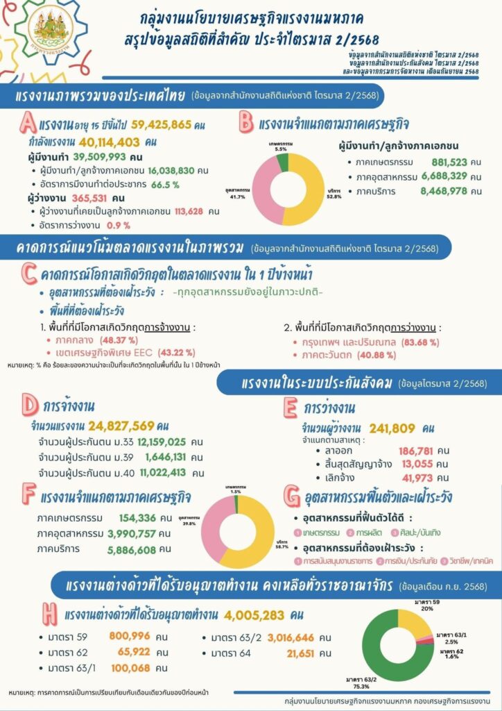 สำหรับข้อมูลด้านกำลังแรงงานในไตรมาส 2/2568 พบว่า ประเทศไทยมีประชากรวัยแรงงาน (อายุ 15 ปีขึ้นไป) จำนวน 59.43 ล้านคน โดยอยู่ในกำลังแรงงาน 40.11 ล้านคน และเป็นผู้มีงานทำ 39.51 ล้านคน ส่งผลให้อัตราการมีงานทำต่อประชากรอยู่ที่ร้อยละ 66.5 ซึ่งเพิ่มขึ้นจากไตรมาสก่อนหน้า ขณะที่อัตราการว่างงานอยู่ที่ ร้อยละ 0.9 ซึ่งถือว่าต่ำเมื่อเทียบกับหลายประเทศในภูมิภาค