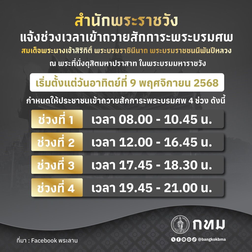 สำนักพระราชวัง กำหนดให้ประชาชนสามารถเข้าถวายสักการะพระบรมศพ ใน 4 ช่วงเวลา ดังนี้ ช่วงที่ 1 เวลา 08.00-10.45 น. ช่วงที่ 2 เวลา 12.00-16.45 น. ช่วงที่ 3 เวลา 17.45-18.30 น. และช่วงที่ 4 เวลา 19.45-21.00 น.โดยจะเปิดให้เข้ากราบถวายบังคมทุกวัน เริ่มตั้งแต่วันอาทิตย์ที่ 9 พ.ย. 2568 เป็นต้นไปนั้น