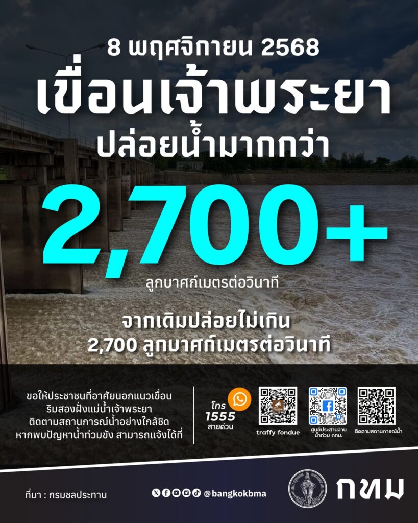 วันที่ 8 พฤศจิกายน 2568 สำนักงานพัฒนาเทคโนโลยีอวกาศและภูมิสารสนเทศ (องค์การมหาชน) หรือ GISTDA เปิดเผยข้อมูลภาพจากแผนที่ถึงพื้นที่เสี่ยงน้ำท่วมฉับพลัน ซึ่งเป็นผลมาจากการเร่งระบายน้ำของ เขื่อนเจ้าพระยา ข้อมูลล่าสุดจาก GISTDA แสดงให้เห็นภาพรวมสถานการณ์น้ำใน ลุ่มเจ้าพระยา ที่ต้องเฝ้าระวังอย่างใกล้ชิด เนื่องจากน้ำจากพื้นที่ตอนบนของประเทศยังคงไหลหลากลงสู่แม่น้ำเจ้าพระยาอย่างต่อเนื่อง ส่งผลให้เขื่อนเจ้าพระยาจำเป็นต้องเพิ่มการระบายน้ำเพื่อรองรับมวลน้ำที่กำลังจะมาสมทบ