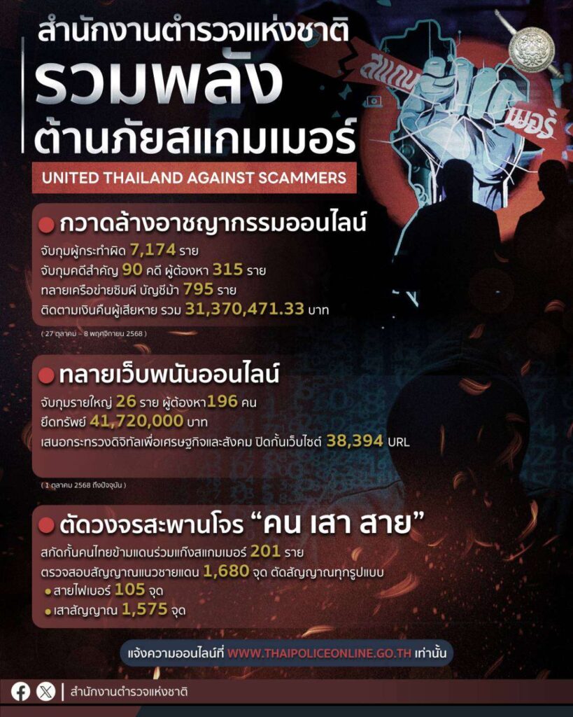 วันที่ 10 พฤศจิกายน 2568 นายอนุทิน ชาญวีรกูล นายกรัฐมนตรีและรัฐมนตรีว่าการกระทรวงมหาดไทย เป็นประธานการแถลงข่าวการป้องกันและปราบปรามการกระทำความผิดอาชญากรรมทางเทคโนโลยี “รวมพลังคนไทย ต้านภัยสแกมเมอร์” United Thailand Against Scammers ณ ห้องประชุมแจ้งยอดสุข อาคารศูนย์ฝึกอบรม ตม. สำนักงานตำรวจแห่งชาติ โดยมี นางสาวไตรศุลี ไตรสรณกุล เลขาธิการนายกรัฐมนตรี, พล.ต.อ.กิตติ์รัฐ พันธุ์เพ็ชร์ ผู้บัญชาการตำรวจแห่งชาติ (ผบ.ตร.) พร้อมด้วย รอง ผบ.ตร. ประกอบด้วย พล.ต.อ.ธนา ชูวงศ์, พล.ต.อ.นิรันดร เหลื่อมศรี, พล.ต.อ.กรไชย คล้ายคลึง, พล.ต.อ.ธัชชัย ปิตะนีละบุตร และผู้ช่วย ผบ.ตร., รองจเรตำรวจแห่งชาติ, ผู้บัญชาการและผู้แทนหน่วยต่าง ๆ ที่เกี่ยวข้อง เข้าร่วม