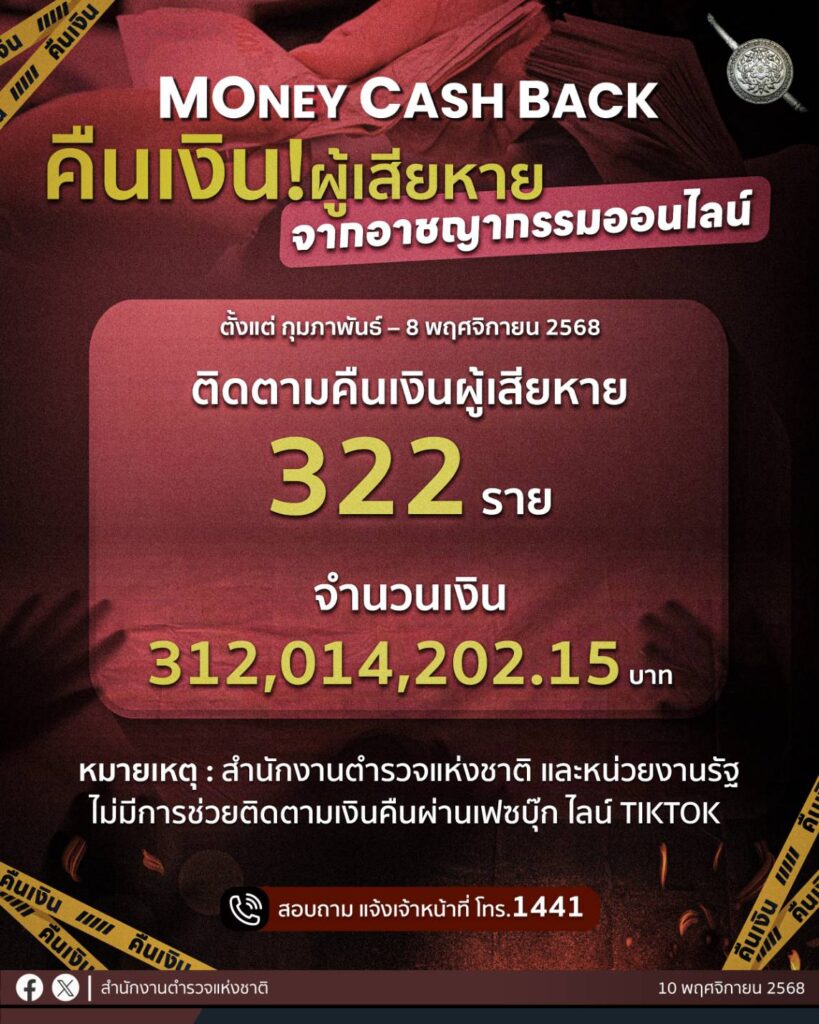 7. ติดตามเงินคืนให้กับผู้เสียหาย (Money Cash Back) ได้รวม 234 ราย และจับกุมผู้ต้องหาได้ 224 คน โดยในวันนี้มีผู้เสียหายเดินทางมารับเงินคืนในงานแถลงข่าว รวมจำนวน 31 ราย เป็นเงินรวม 14,604,248 บาท (ทั้งนี้ ตั้งแต่เริ่มโครงการ Money Cash Back กุมภาพันธ์ 2568-ปัจจุบัน สามารถคืนเงินให้กับผู้เสียหายได้ 322 ราย เป็นจำนวนเงินรวม 312,014,202.15 บาท) 8. สกัดกั้นคนไทยที่จะเดินทางออกนอกประเทศเพื่อไปร่วมขบวนการ Scammer ได้ 123 ครั้ง 201 คน 9. ปฏิบัติการขยายผลเส้นทางการเงินต้องสงสัยจากศูนย์ War Room รวม 128 ราย ผู้ต้องหา 133 คน 10. มีการระดมจับกุมผู้ต้องหาตามหมายจับคดีอาชญากรรมทางเทคโนโลยีอย่างต่อเนื่อง โดยในห้วงวันที่ 1 – 8 พฤศจิกายน 2568 (รวม 8 วัน) จับกุมได้ 965 คน11. จับกุมคดีอาชญากรรมทางเทคโนโลยีอื่นๆ เช่น การพนันออนไลน์, จำหน่ายอาวุธปืนออนไลน์ ฯลฯ จำนวน 3,083 คดี ผู้ต้องหา 3,103 คน