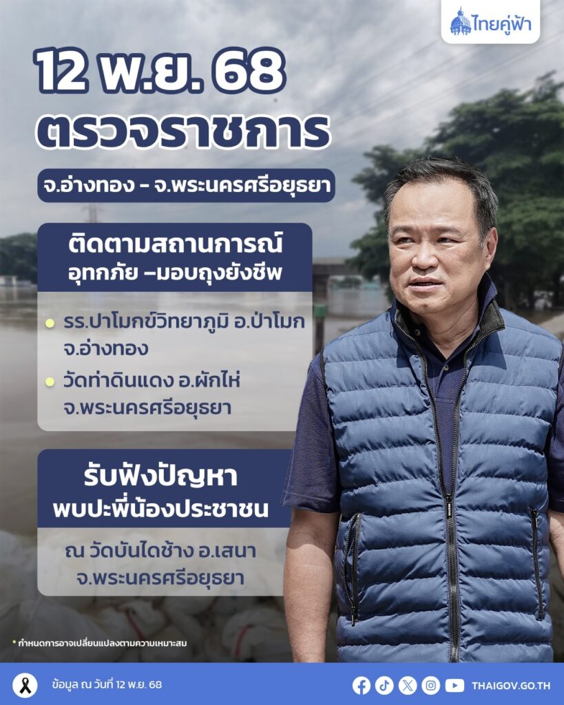 วันที่ 12 พฤศจิกายน 2568 นายอนุทิน ชาญวีรกูล นายกรัฐมนตรีและรัฐมนตรีว่าการกระทรวงมหาดไทย มีกำหนดลงพื้นที่ตรวจราชการจังหวัดอ่างทองและพระนครศรีอยุธยา เพื่อติดตามสถานการณ์น้ำท่วมในพื้นที่ภาคกลางตอนบน พร้อมรับฟังปัญหา ให้กำลังใจประชาชน และสั่งการหน่วยงานที่เกี่ยวข้องให้บูรณาการช่วยเหลืออย่างเร่งด่วน