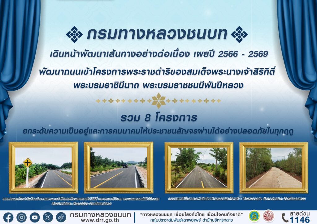 กรมทางหลวงชนบทเดินหน้าพัฒนาเส้นทางอย่างต่อเนื่อง เผยปี 2566 – 2569 พัฒนาถนนเข้าโครงการพระราชดำริของสมเด็จพระนางเจ้าสิริกิติ์ พระบรมราชินีนาถ พระบรมราชชนนีพันปีหลวง รวม 8 โครงการ ยกระดับความเป็นอยู่และการคมนาคมให้ประชาชนสัญจรผ่านได้อย่างปลอดภัยในทุกฤดู