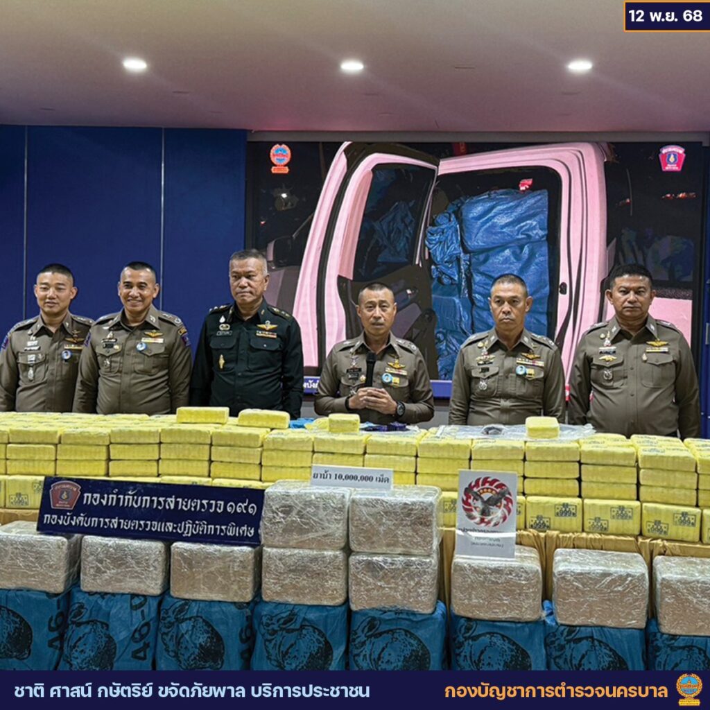 วันที่ 12 พฤศจิกายน 2568 พล.ต.อ.สำราญ นวลมา ผบ.ตร. พร้อมด้วย พล.ต.ท.สยาม บุญสม ผบช.น., พล.ต.ต.ธีรเดช ธรรมสุธีร์ รอง ผบช.น. (รับผิดชอบด้านยาเสพติด), พล.ต.ต.วรวิทย์ ญาณจินดา ผบก.สปพ., พ.ต.อ.วสันต์ ธวัชชัยวิรุตษ์ ผกก.สายตรวจ, พ.ต.ท.วสุเทพ ใจอินทร์ รอง ผกก.สายตรวจ และ พ.อ.วิรุฬห์ ชัยสุวิรัตน์ หน่วยข่าวกรองทางทหาร กองทัพบก ร่วมกันแถลงข่าวผลการจับกุมเครือข่ายค้ายาเสพติดรายใหญ่ในพื้นที่จังหวัดพระนครศรีอยุธยา ภายใต้ปฏิบัติการ “ทลายโกดังซ่อนยานรก”