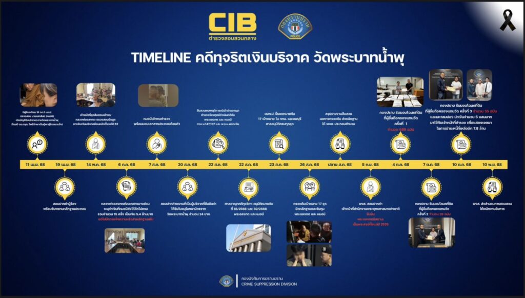 วันที่ 13 พฤศจิกายน 2568 ที่กองบัญชาการตำรวจสอบสวนกลาง (CIB) ตำรวจกองปราบ ร่วมกับ สำนักงานการตรวจเงินแผ่นดิน ,สำนักงาน ป.ป.ช. , ป.ป.ท.,สำนักงาน ป.ป.ง. แถลงเปิดปฏิบัติการ หลังจากที่เมื่อวันที่ 11 เมษายน 2568 ดร.ตฤณห์ โพธิ์รักษา นักอาชญาวิทยา และอาจารย์ประจำภาควิชาสังคมศาสตร์ (สาขาอาชญาวิทยา) คณะสังคมศาสตร์และมนุษยศาสตร์ ของมหาวิทยาลัยรัฐแห่งหนึ่ง พาผู้ร้องเรียนเข้าพบเจ้าหน้าที่ตำรวจ กองกำกับการ 1 กองบังคับการปราบปราม เพื่อให้ข้อมูลว่า “ทูตสื่อวิญญาณ หรือ หมอบี” มีพฤติการณ์ทุจริตเงินบริจาคของวัดพระบาทน้ำพุ ที่ประชาสัมพันธ์เปิดขอรับบริจาคเงินผ่านโซเชียลมีเดีย