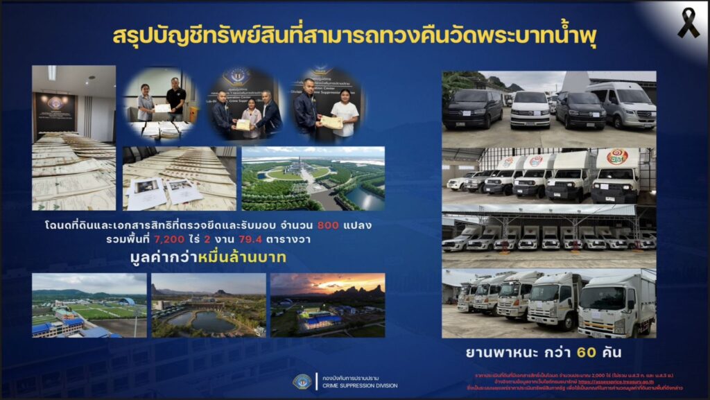 และหลังจากการจับกุมผู้ต้องหาทั้งสองรายนี้แล้วนั้น เจ้าหน้าที่ตำรวจกองบัญชาการตำรวจสอบสวนกลาง ได้บูรณาการร่วมกัน เพื่อสืบสวนติดตามทรัพย์สิน ที่บุคคลอื่นมีชื่อถือครองไว้แทนวัดพระบาทน้ำพุ ให้นำกลับมาคืนสู่วัดพระบาทน้ำพุ จนเป็นที่มาของ การได้กลับคืนมาซึ่งโฉนดที่ดิน เอกสารถือครองที่ดิน ยานพาหนะ จากผู้ถือครองแทน ดังนี้