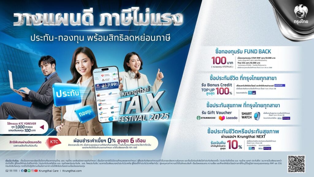 ธนาคารกรุงไทย ตอกย้ำความเป็นผู้นำด้านการลงทุน จัดแคมเปญใหญ่ส่งท้ายปี “Krungthai Tax Festival 2025 วางแผนดี ภาษีไม่แรง ใช้สิทธิ์ให้เต็ม ลดหย่อนให้คุ้ม” โดยคัดสรรผลิตภัณฑ์ประกันชีวิต ประกันสุขภาพ และการลงทุนแบบครบวงจร ที่ตอบโจทย์ทุกไลฟ์สไตล์การเงิน พร้อมเสริมสร้างความมั่นคงทางการเงิน และการวางแผนสิทธิลดหย่อนภาษีปลายปีได้อย่างคุ้มค่า