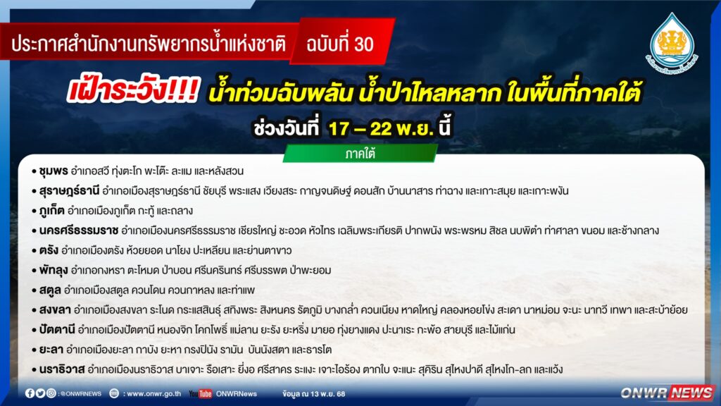 สำนักงานทรัพยากรน้ำแห่งชาติ (สทนช.) ประกาศ สำนักงานทรัพยากรน้ำแห่งชาติ ฉบับที่ 30/2568 เรื่อง เฝ้าระวังน้ำท่วมฉับพลัน น้ำป่าไหลหลาก ในพื้นที่ภาคใต้ ในช่วงวันที่ 17 – 22 พฤศจิกายน 2568