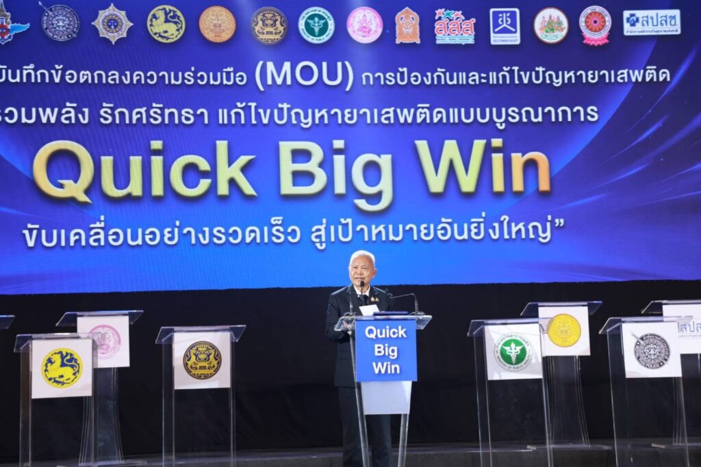 วันที่ 17 พฤศจิกายน 2568 นายโสภณ ซารัมย์ รองนายกรัฐมนตรี เป็นประธานพิธีลงนามบันทึกข้อตกลงความร่วมมือการป้องกันและแก้ไขปัญหายาเสพติดด้านการบำบัดรักษาและฟื้นฟูผู้ติดยาเสพติด “รวมพลังรัก ศรัทธา แก้ปัญหายาเสพติดแบบบูรณาการ Quick Big Win : ขับเคลื่อนอย่างรวดเร็ว สู่เป้าหมายอันยิ่งใหญ่” พร้อมด้วย พล.ต.ท. รุทธพล เนาวรัตน์ รัฐมนตรีว่าการกระทรวงยุติธรรม พ.ต.ต. สุริยา สิงหกมล เลขาธิการ ป.ป.ส. และหน่วยงานภาคีรวมกว่า 16 หน่วยงานร่วมลงนาม ณ ห้อง Prince Grand Ballroom ชั้น 11 โรงแรมปรินซ์ พาเลซ กรุงเทพมหานคร