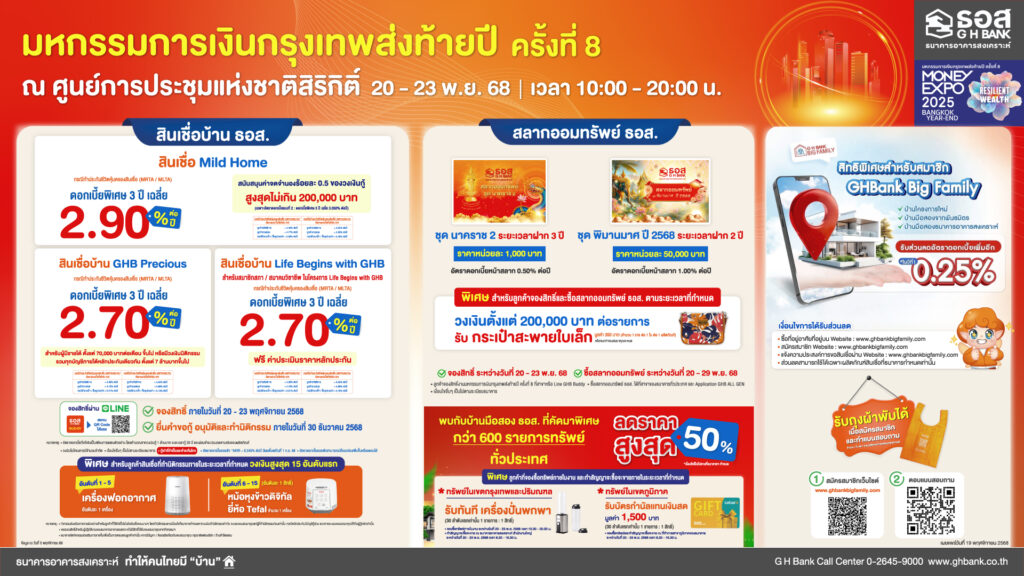 งาน “มหกรรมการเงินกรุงเทพส่งท้ายปี ครั้งที่ 8 (MONEY EXPO 2025 BANGKOK – YEAR END)” จัดขึ้นระหว่างวันที่ 20 – 23 พฤศจิกายน 2568 ณ ศูนย์การประชุมแห่งชาติสิริกิติ์ สามารถสอบถามรายละเอียดเพิ่มเติมได้ที่ ธอส. ทุกสาขาทั่วประเทศ G H Bank Call Center โทร 0-2645-9000, Website : www.ghbank.co.th หรือ Facebook Fanpage ธนาคารอาคารสงเคราะห์ และติดตามข่าวสารของธนาคารได้ที่ GHBank Social Media