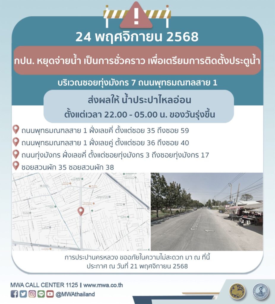 การประปานครหลวง (กปน.) แจ้งว่า กปน.เตรียมการติดตั้งประตูน้ำ ในพื้นที่บริเวณซอยทุ่งมังกร 7 ถนนพุทธมณฑลสาย 1 เพื่อให้ประชาชนได้รับบริการน้ำประปาอย่างเพียงพอและทั่วถึง จึงมีความจำเป็นต้องหยุดจ่ายน้ำ เป็นการชั่วคราว ในคืนวันจันทร์ที่ 24 พฤศจิกายน 2568ตั้งแต่เวลา 22.00 – 05.00 น. ของวันรุ่งขึ้น โดยระหว่างดำเนินการ ส่งผลให้ น้ำประปาไหลอ่อน ในพื้นที่ดังต่อไปนี้