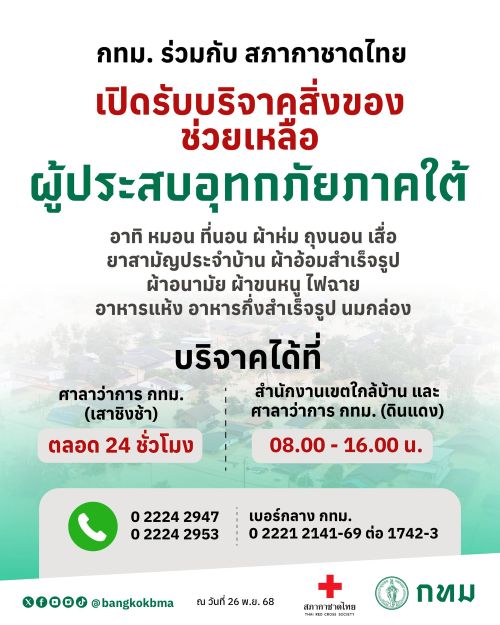 วันที่ 26 พฤศจิกายน 2568 นายณรงค์ เรืองศรี ปลัดกรุงเทพมหานคร(กทม.) เปิดเผยว่า กรุงเทพมหานคร ร่วมกับสภากาชาดไทย เปิดรับบริจาคสิ่งของจำเป็นเพื่อช่วยเหลือผู้ประสบอุทกภัยภาคใต้ โดยตั้งจุดรับบริจาค 52 จุด ทั่วกรุงเทพฯ จุดหลักที่ศาลาว่าการกรุงเทพมหานคร เสาชิงช้า เปิดรับตลอด 24 ชั่วโมง ส่วนจุดรับบริจาคที่ศาลาว่าการกรุงเทพมหานคร 2 ดินแดง และที่สำนักงานเขตทั้ง 50 เขต จะเปิดรับบริจาคทุกวัน ตั้งแต่เวลา 08.00 - 16.00 น. ทั้งนี้ สิ่งของที่กรุงเทพมหานครได้รับบริจาคมา จะส่งมอบให้กับสภากาชาดไทยเพื่อนำไปช่วยเหลือผู้ประสบภัยต่อไป