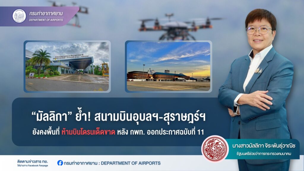 “มัลลิกา” ย้ำ! สนามบินอุบลฯ-สุราษฎร์ฯ พื้นที่ห้ามบินโดรนเด็ดขาด หลัง กพท. ออกประกาศฉบับที่11 ประสานหน่วยความมั่นคงรับมือสถานการณ์ฉุกเฉินชายแดนไทย-กัมพูชา