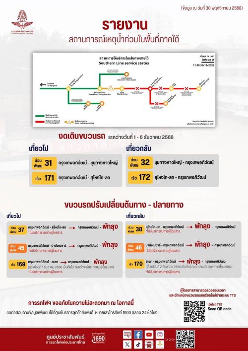 การรถไฟฯ ขออภัยในความไม่สะดวกมา ณ โอกาสนี้ สำหรับประชาชนที่ซื้อตั๋วโดยสารไว้ล่วงหน้าในเส้นทางดังกล่าว หากไม่ประสงค์เดินทางสามารถติดต่อขอคืนเงินค่าตั๋วโดยสารได้เต็มราคาที่สถานีรถไฟทุกแห่งทั่วประเทศ พร้อมแนะนำให้ผู้โดยสารตรวจสอบข้อมูลการเดินรถก่อนออกเดินทางผ่านช่องทางประชาสัมพันธ์ของ รฟท. ทั้งนี้ สามารถตรวจสอบเวลาและตำแหน่งขบวนรถแบบเรียลไทม์ได้ทาง https://ttsview.railway.co.th/v3/floodingNST/ หรือสอบถามข้อมูลเพิ่มเติมได้ที่สถานีรถไฟทั่วประเทศ และศูนย์บริการลูกค้าสัมพันธ์ โทร. 1690 ตลอด 24 ชั่วโมง