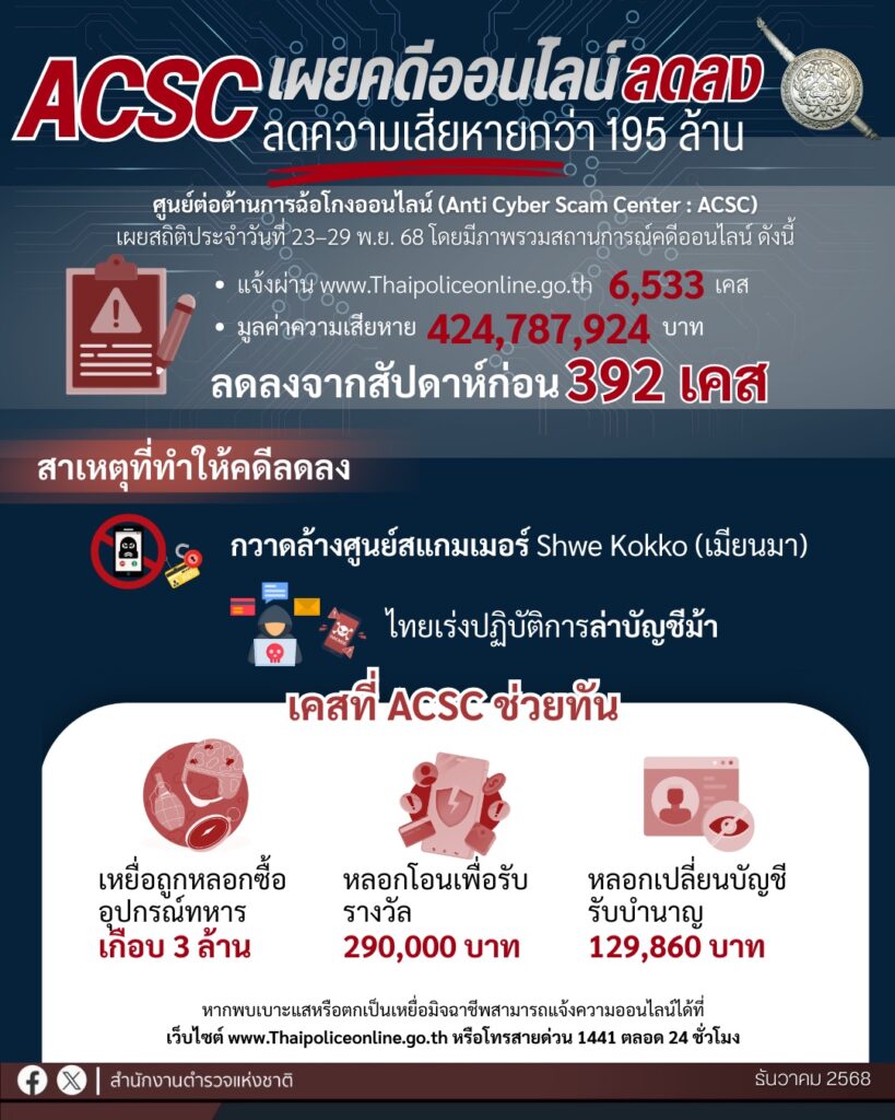 ศูนย์ต่อต้านการฉ้อโกงออนไลน์ สำนักงานตำรวจแห่งชาติ ภายใต้การอำนวยการ พล.ต.อ.ธนา ชูวงศ์ รอง ผบ.ตร./ผอ.ศปอส.ตร. และ พล.ต.ท.จิรภพ ภูริเดช ผู้ช่วย ผบ.ตร./รอง ผอ.ศปอส.ตร. เปิดสถิติคดีและความเสียหายในรอบสัปดาห์ที่ผ่านมา ตั้งแต่วันที่ 23-29 พ.ย.68 มีคดีที่รับแจ้งเข้ามาผ่านทาง www.Thaipoliceonline.go.th จำนวน 6,533 เคส มูลค่าความเสียหาย 424,787,924 บาท ซึ่งคดีที่รับแจ้งลดลงจากห้วงวันที่ 16-22 พ.ย.68 จำนวน 392 เคส และมูลค่าความเสียหายลดลง 195,750,710 บาท