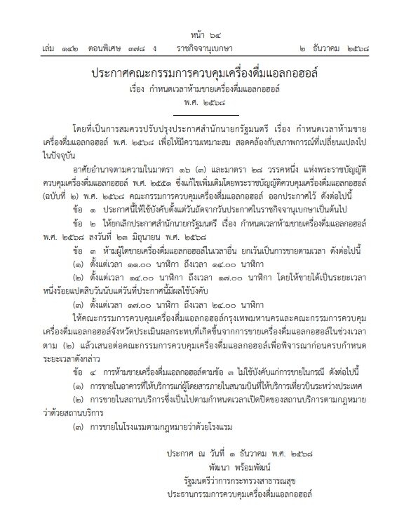 วันที่ 3 ธันวาคม 2568 ผู้สื่อข่าวรายงานว่า เว็บไซต์ ราชกิจจาบุเบกษา เผยแพร่ ประกาศคณะกรรมการควบคุมเครื่องดื่มแอลกอฮอล์ เรื่องกำหนดเวลาห้ามขายเครื่องดื่มแอลกอฮอล์ พ.ศ.2568 ความว่า