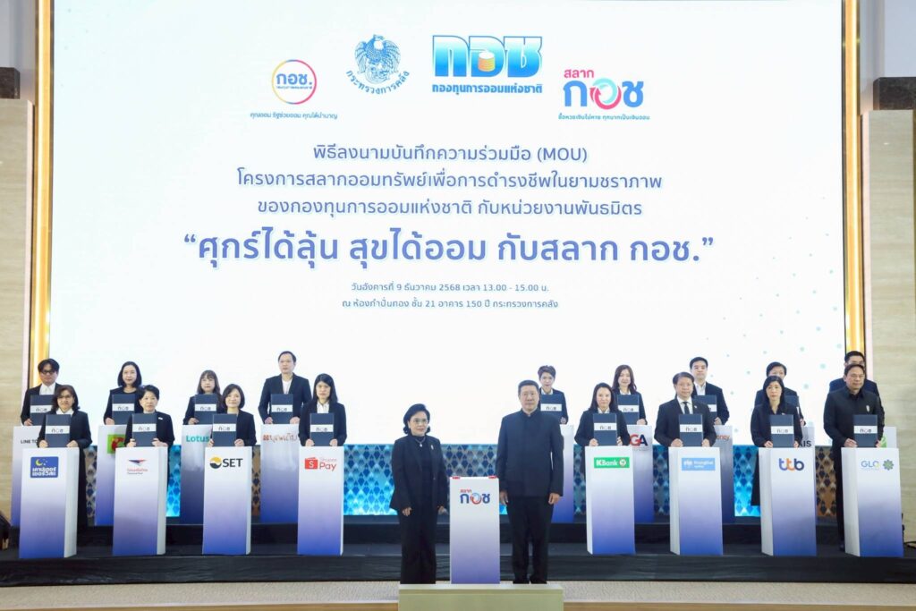 วันที่ 9 ธันวาคม 2568 กองทุนการออมแห่งชาติ (กอช.) จัดงานแถลงข่าวบันทึกความร่วมมือ (MOU) โครงการสลากออมทรัพย์เพื่อการดำรงชีพในยามชราภาพของกองทุนการออมแห่งชาติ กับหน่วยงานพันธมิตร “ศุกร์ได้ลุ้น สุขได้ออม กับสลาก กอช.” เพื่อยกระดับการออมของคนไทยเข้าสู่การออมผ่านดิจิทัล ที่สะดวก รวดเร็ว ครอบคลุมทุกช่องทาง ทุกพื้นที่ พร้อมลุ้นรางวัลใหญ่ 1 ล้านบาททุกสัปดาห์ ณ ห้องกำปั่นทอง ชั้น 21 อาคาร 150 ปี กระทรวงการคลัง  โดยภายในงานยังได้เปิดตัวแอปพลิเคชัน กอช. รูปแบบใหม่ ที่จะสามารถทำธุรกรรม เปิดบัญชี ติดตามเงินออม ข้อมูลข่าวสารของสมาชิก กอช. รวมถึงการจำหน่ายสลาก กอช. ในอนาคตด้วย