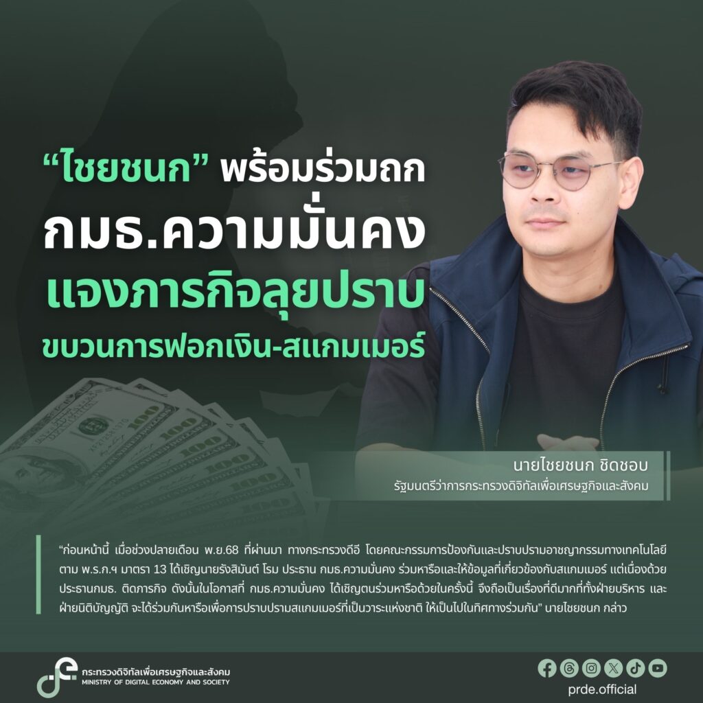“ก่อนหน้านี้ เมื่อช่วงปลายเดือน พ.ย.68 ที่ผ่านมา ทางกระทรวงดีอี โดยคณะกรรมการป้องกันและปราบปรามอาชญากรรมทางเทคโนโลยี ตาม พ.ร.ก.ฯ มาตรา 13 ได้เชิญนายรังสิมันต์ โรม ประธาน กมธ.ความมั่นคง ร่วมหารือและให้ข้อมูลที่เกี่ยวข้องกับสแกมเมอร์ แต่เนื่องด้วย ประธานกมธ. ติดภารกิจ ดังนั้นในโอกาสที่ กมธ.ความมั่นคง ได้เชิญตนร่วมหารือด้วยในครั้งนี้ จึงถือเป็นเรื่องที่ดีมากที่ทั้งฝ่ายบริหาร และฝ่ายนิติบัญญัติ จะได้ร่วมกันหารือเพื่อการปราบปรามสแกมเมอร์ที่เป็นวาระแห่งชาติ ให้เป็นไปในทิศทางร่วมกัน” นายไชยชนก กล่าว