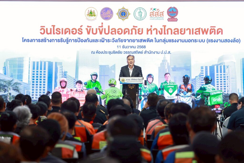 วันที่ 11 ธันวาคม 2568 สำนักงาน ป.ป.ส. เปิดปฏิบัติการเชิงรุกดึงกลุ่มแรงงานนอกระบบ “วินมอเตอร์ไซค์-ไรเดอร์” ร่วมเครือข่ายเฝ้าระวังยาเสพติด จัดกิจกรรม “วินไรเดอร์ ขับขี่ปลอดภัย ห่างไกลยาเสพติด” มุ่งสร้างเกราะป้องกันไม่ให้ตกเป็นเครื่องมือขนส่งสิ่งผิดกฎหมาย พร้อมระดมพลังจิตอาสาช่วยสอดส่องดูแลความปลอดภัยในชุมชนรับเทศกาลปีใหม่