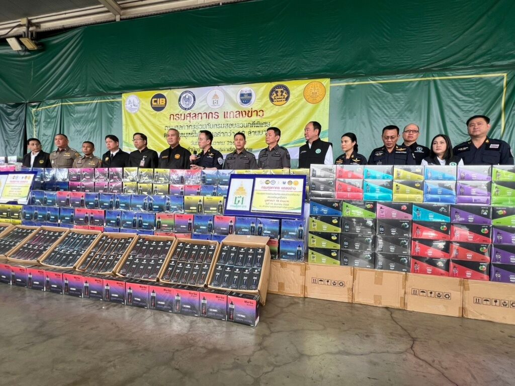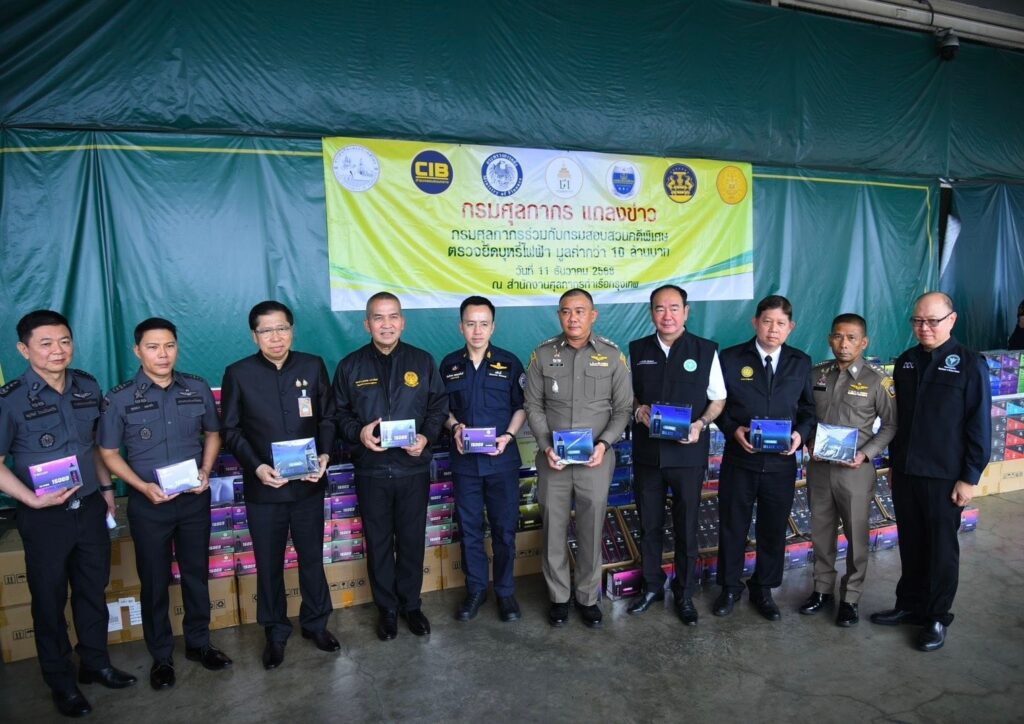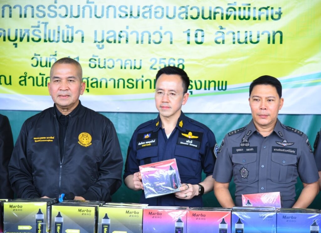 กรมศุลกากรร่วมกับกรมสอบสวนคดีพิเศษตรวจยึดบุหรี่ไฟฟ้า มูลค่ากว่า 10 ล้านบาทตรวจยึด “บุหรี่ไฟฟ้า” ชนิดใช้แล้วทิ้ง จำนวน 46,260 ชิ้น มูลค่า 10,871,100 บาท