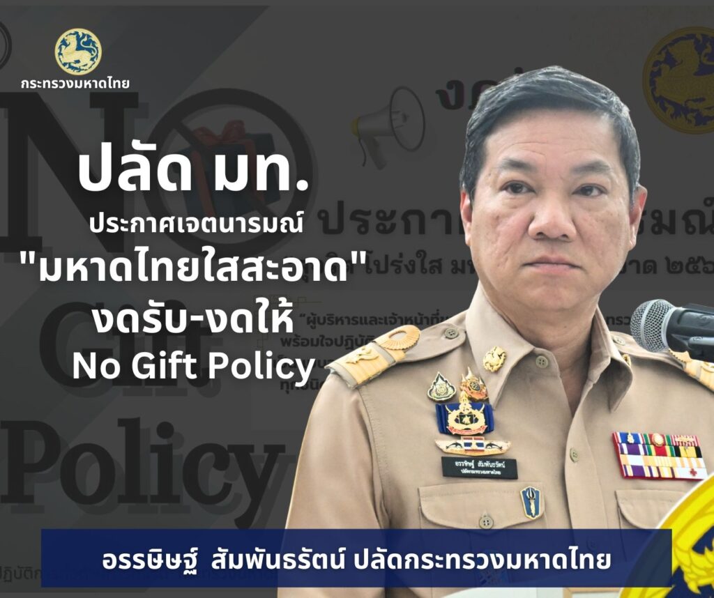 วันที่ 15 ธันวาคม 2568 นายอรรษิษฐ์ สัมพันธรัตน์ ปลัดกระทรวงมหาดไทย เปิดเผยว่า กระทรวงมหาดไทยได้มีประกาศเจตนารมณ์เรื่อง “สุจริต โปร่งใส มหาดไทยใสสะอาด 2569” และนโยบาย “งดรับ งดให้” ของขวัญ ของกำนัลทุกชนิดจากการปฏิบัติหน้าที่ (No Gift Policy) เพื่อเป็นการแสดงจุดยืนที่ชัดเจนในการต่อต้านการทุจริตคอร์รัปชันทุกรูปแบบ และมุ่งมั่นที่จะนำพาบุคลากรในสังกัดให้ยึดมั่นในสถาบันหลักของประเทศ ทั้งชาติ ศาสนา และพระมหากษัตริย์ รวมถึงการปกครองในระบอบประชาธิปไตยอันมีพระมหากษัตริย์ทรงเป็นประมุข