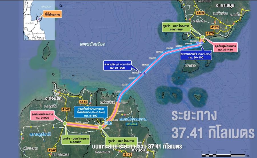 โครงการทางพิเศษเชื่อมเกาะสมุย จุดเริ่มต้นโครงการ จากจ.สุราษฎร์ /นครศรีธรรมราช สิ้นสุด ต.ตลิ่งงาม อ.เกาะสมุย สุราษฎร์ธานี รูปแบบโครงการ เป็นทางพิเศษเก็บค่าผ่านทางรูปแบบทางเชื่อมเกาะ เปิดให้บริการ 24ชม. ระยะทาง 37.41 กม. จุดเริ่มต้นโครงการเชื่อมกับ ทล.4142 บริเวณกม.14+500 ในพื้นที่ต.ดอนสัก อ.ดอนสัก สุราษฎร์ธานี จุดสิ้นสุดโครงการ กม.37+410 เชื่อมกั ทล.4170 บริเวณกม.9+000 ในพื้นที่ต.ตลิ่งงาม อ.เกาะสมุย สุราษฎร์ธานี