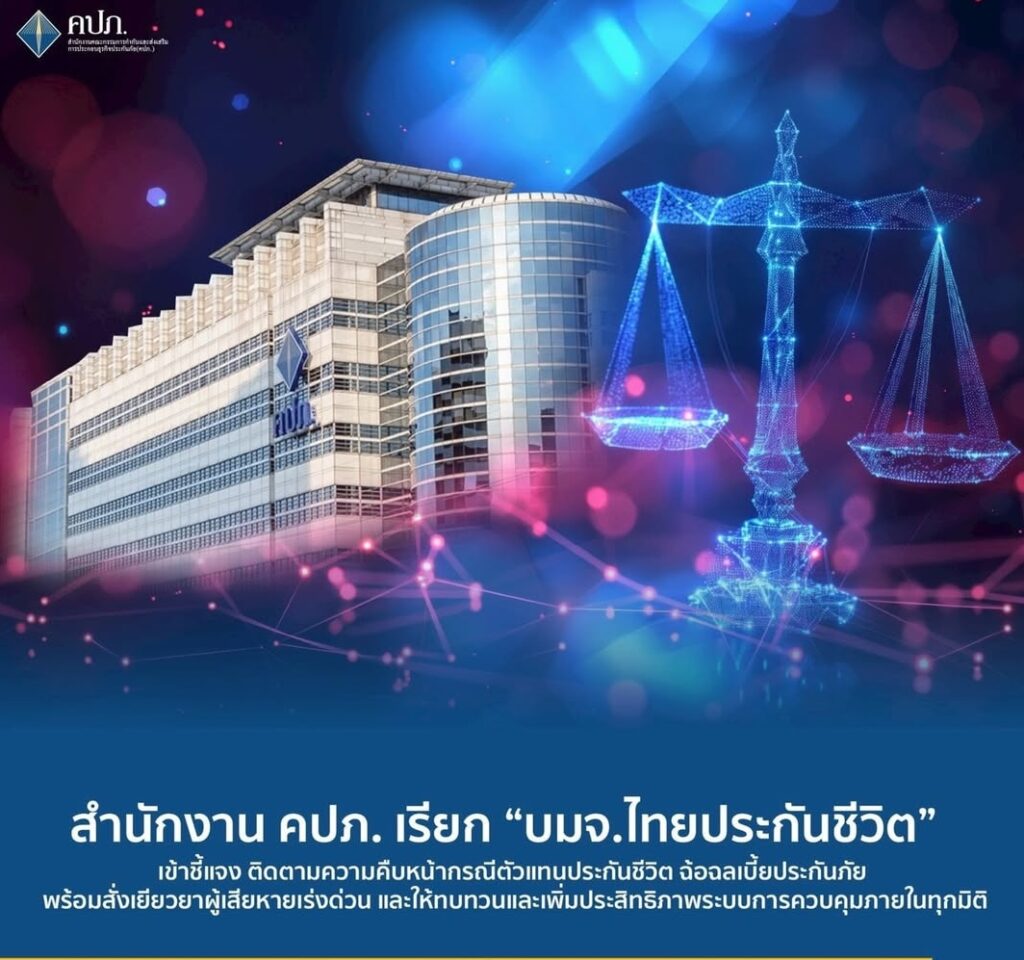 สำนักงาน คปภ. เรียก “บมจ.ไทยประกันชีวิต” แจง ความคืบหน้ากรณีตัวแทนประกันชีวิตโกงเบี้ยประกัน ฉ้อฉลเบี้ยประกันภัย พร้อมสั่งเยียวยาผู้เสียหายเร่งด่วน และให้ทบทวนและเพิ่มประสิทธิภาพระบบการควบคุมภายในทุกมิติ