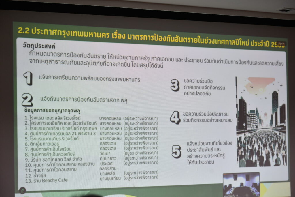 สำหรับการประชุมวันนี้ ที่ประชุมได้มีการรายงานถึงแผนความปลอดภัยโดยเน้นการบูรณาการความร่วมมือระหว่างหน่วยงานต่าง ๆ ที่เกี่ยวข้อง เช่น มาตรการควบคุมการเล่นดอกไม้เพลิง การตรวจสอบระบบป้องกันอัคคีภัยในสถานบันเทิง การจัดเตรียมทีมแพทย์ฉุกเฉินประจำจุดต่าง ๆ การอำนวยความสะดวกด้านการเดินทางโดยมีการขยายเวลาให้บริการระบบขนส่งสาธารณะ การบริหารจัดการฝูงชนและจัดทางออกฉุกเฉินในพื้นที่จัดงานใหญ่ ๆ เป็นต้น