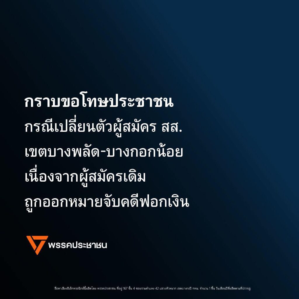พรรคประชาชน โพสต์ข้อความผ่านเฟสบุ๊ค กราบขอโทษพี่น้องประชาชนอย่างสูง โดยเฉพาะชาวบางพลัดและบางกอกน้อย จากกรณีที่บุญฤทธิ์ เรารุ่งโรจน์ ผู้สมัคร สส. พรรคประชาชน เขตบางพลัด-บางกอกน้อย ถูกออกหมายจับคดีฟอกเงิน ทำให้พรรคตัดสินใจเปลี่ยนตัวผู้สมัคร สส. ในเขตนี้