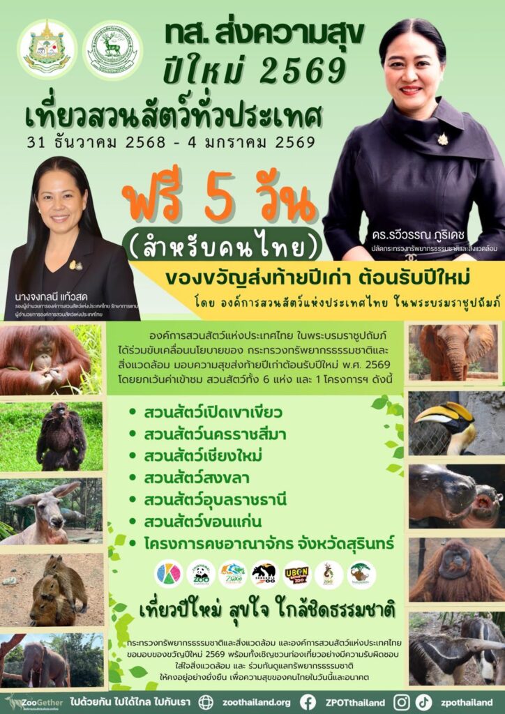 องค์การสวนสัตว์แห่งประเทศไทย ในพระบรมราชูปถัมภ์ ได้ร่วมขับเคลื่อนนโยบายของกระทรวงทรัพยากรธรรมชาติและสิ่งแวดล้อม มอบความสุขส่งท้ายปีเก่าต้อนรับปีใหม่ พ.ศ. 2569 ให้แก่ประชาชน ภายใต้แนวคิด “สร้างสุขคนไทย จากใจ ทส.” โดยดำเนินมาตรการ ยกเว้นค่าเข้าชมสวนสัตว์ ฟรี (เฉพาะคนไทย) ตลอดช่วงวันหยุดเทศกาลปีใหม่ ครอบคลุมสวนสัตว์ในสังกัด 6 แห่ง และ 1 โครงการ ทั่วประเทศ ดังนี้ สวนสัตว์เปิดเขาเขียว สวนสัตว์นครราชสีมา สวนสัตว์เชียงใหม่ สวนสัตว์สงขลา สวนสัตว์อุบลราชธานี สวนสัตว์ขอนแก่น โครงการคชอาณาจักร จังหวัดสุรินทร์
