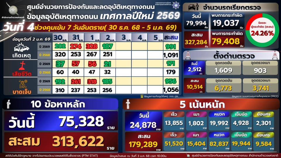 จากสถิติการเกิดอุบัติเหตุทางถนนในช่วง 4 วันของเทศกาลปีใหม่ 2569 คือวันที่ 30 ธันวาคม 2568 ถึงวันที่ 2 มกราคม 2569 ภาพรวมทั้งประเทศ เสียชีวิต 171 ราย บาดเจ็บ 956 ราย พบว่าลดลงจากช่วงเวลาเดียวกันของปีที่ผ่านมา โดยในส่วนของการบังคับใช้กฎหมายเพื่อป้องกันและลดอุบัติเหตุทางถนน ใน 10 ข้อหาหลักที่เป็นสาเหตุของการเกิดอุบัติเหตุ มีการจับกุมรวมทุกคดีใน 10 ข้อหาหลักถึง 313,622 ราย โดยเป็นการจับกุมเมาแล้วขับ รวมแล้วจำนวน 15,404 ราย ในจำนวนนี้เป็นการดำเนินคดีกับผู้กระทำผิดซ้ำเมาแล้วขับ จำนวน 100 ราย ซึ่งผู้กระทำความผิดฐานเมาแล้วขับซ้ำภายใน 2 ปี จะเข้าข่ายความผิดตามพระราชบัญญัติจราจรทางบก พ.ศ.2522 มีโทษสูงขึ้น จำคุกไม่เกิน 2 ปี ปรับตั้งแต่ 50,000 – 100,000 บาท และศาลสั่งพักใช้หรือเพิกถอนใบอนุญาตขับขี่