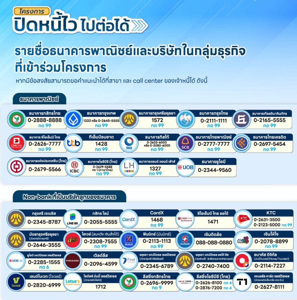 กระทรวงการคลัง ธนาคารแห่งประเทศไทย (ธปท.) และภาคสถาบันการเงิน ได้ร่วมกันออกกลไกเฉพาะกิจเพื่อช่วยเหลือลูกหนี้ ภายใต้โครงการ “ปิดหนี้ไว ไปต่อ เพื่อให้ลูกหนี้รายย่อยสามารถมาแก้ไขปัญหาหนี้เสียกลับมาเริ่มต้นทางการเงินใหม่ได้อีกครั้ง
