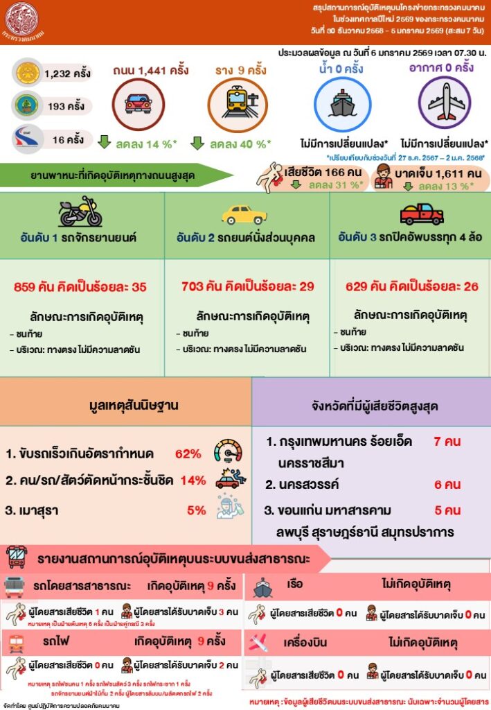 ส่วนสถิติอุบัติเหตุบนโครงข่ายของกระทรวงฯ ระหว่างวันที่ 30 ธันวาคม 2568 – 5 มกราคม 2569 ณ วันที่ 6 มกราคม 2569 เวลา 07.30 น. ได้แก่ ทางถนน เกิดอุบัติเหตุรวม 1,441 ครั้ง/ ผู้เสียชีวิต 166 คน ผู้บาดเจ็บ 1,611 คน สาเหตุ คือ ขับรถเร็วเกินอัตรากำหนด 900 ครั้ง คิดเป็นร้อยละ 62 ยานพาหนะที่เกิดเหตุสูงสุด คือ รถจักรยานยนต์ 859 คัน คิดเป็นร้อยละ 35 บริเวณที่เกิดเหตุสูงสุด คือ ทางตรง ไม่มีความลาดชัน และจังหวัดที่มีผู้เสียชีวิตสูงสุด คือ กรุงเทพฯ 72 ครั้ง โดยสรุปเมื่อเปรียบเทียบกับปีที่แล้ว จำนวนอุบัติเหตุลดลงร้อยละ 14 จำนวนผู้เสียชีวิตลดลงร้อยละ 31 และจำนวนผู้บาดเจ็บลดลงร้อยละ 13