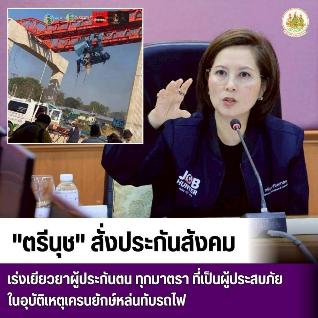 “ตรีนุช” สั่งประกันสังคม เร่งเยียวยาผู้ประกันตน ทุกมาตรา ที่เป็นผู้ประสบภัยในอุบัติเหตุเครนยักษ์หล่นทับรถไฟ
