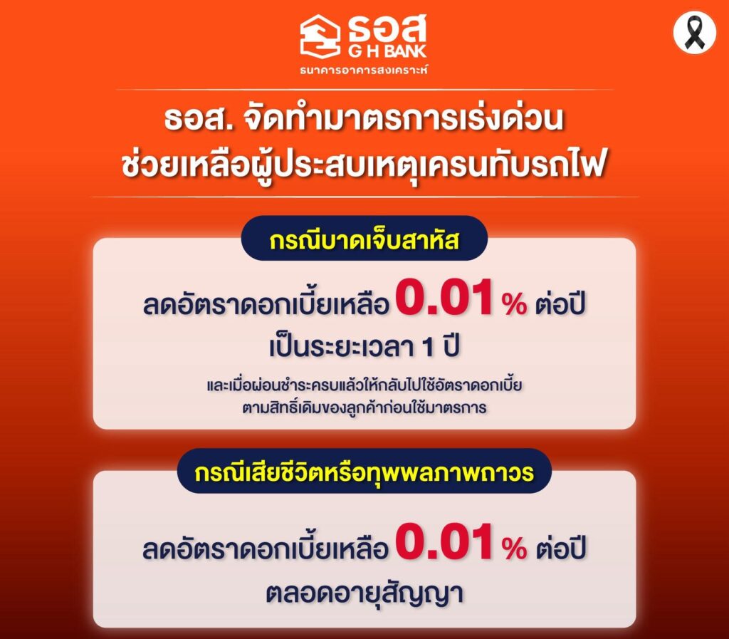 ธอส. จัดทำมาตรการเร่งด่วนช่วยเหลือลูกค้าที่ประสบเหตุเครนหล่นทับรถไฟลดดอกเบี้ยเหลือ 0.01% ต่อปี ให้ลูกค้าที่ได้รับบาดเจ็บสาหัส – เสียชีวิต