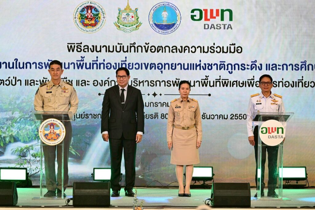 ​วันที่ 16 มกราคม 2569 นายอรรถพล เจริญชันษา อธิบดีกรมอุทยานแห่งชาติ สัตว์ป่า และพันธุ์พืช พร้อมด้วย นายศิริปกรณ์ เชี่ยวสมุทร ผู้อำนวยการองค์การบริหารการพัฒนาพื้นที่พิเศษเพื่อการท่องเที่ยวอย่างยั่งยืน (องค์การมหาชน) หรือ อพท. และผู้ช่วยศาสตราจารย์ ศรายุทธ ทรัพย์สุข คณบดีคณะสถาปัตยกรรมศาสตร์ จุฬาลงกรณ์มหาวิทยาลัย ร่วมพิธีลงนามบันทึกข้อตกลงความร่วมมือ (MOU) การส่งเสริม สนับสนุน และประสานงานในการพัฒนาพื้นที่ท่องเที่ยวเขตอุทยานแห่งชาติภูกระดึง และการศึกษา วิจัย และพัฒนาพื้นที่ท่องเที่ยว ระหว่างกรมอุทยานแห่งชาติ สัตว์ป่า และพันธุ์พืช และองค์การบริหารการพัฒนาพื้นที่พิเศษเพื่อการท่องเที่ยวอย่างยั่งยืน (องค์การมหาชน) 2 ฉบับ โดยฉบับที่ 1 เป็นการส่งเสริม สนับสนุน และประสานงานในการพัฒนาพื้นที่ท่องเที่ยวเขตอุทยานแห่งชาติภูกระดึง และฉบับที่ 2 เป็นการศึกษา วิจัย และพัฒนาพื้นที่ท่องเที่ยว