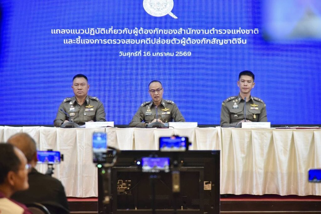 วันที่ 16 มกราคม 2569 เวลา 10.00 น. พล.ต.ท.ไตรรงค์ ผิวพรรณ รองจเรตำรวจแห่งชาติ ในฐานะรองโฆษกสำนักงานตำรวจแห่งชาติ พร้อมด้วย พล.ต.ต.พัลลภ แอร่มหล้า รองผู้บัญชาการตำรวจนครบาล และ พ.ต.อ.ปริญญา กลิ่นเกษร รองผู้บังคับการตรวจคนเข้าเมือง 3 แถลงแนวปฏิบัติเกี่ยวกับผู้ต้องกักของสำนักงานตำรวจแห่งชาติ ตามนโยบายของ พล.ต.อ.กิตติ์รัฐ พันธุ์เพ็ชร์ ผู้บัญชาการตำรวจแห่งชาติ (ผบ.ตร.) และชี้แจงการตรวจสอบคดีปล่อยตัวผู้ต้องกักสัญชาติจีน ณ ห้องสารสิน อาคาร 1 สำนักงานตำรวจแห่งชาติ